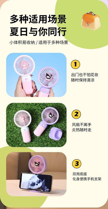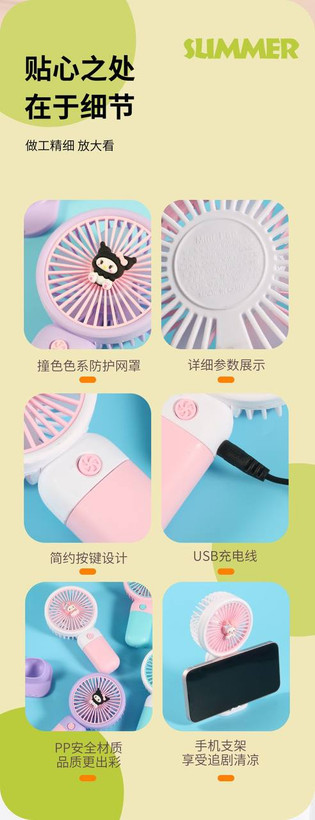 این پنکههای دستی فانتزی، ترکیبی از عملکرد کاربردی و طراحی بامزه هستند که برای کودکان، نوجوانان، یا هر فردی که دنبال یک وسیله خنککننده کوچک و سبک است، بسیار مناسباند. با طراحی جذاب شخصیتهای کارتونی معروف مثل My Melody، Hello Kitty، Kuromi و Cinnamoroll، این محصول علاوه بر کاربردی بودن، حس شادی و لطافت را هم منتقل میکند.